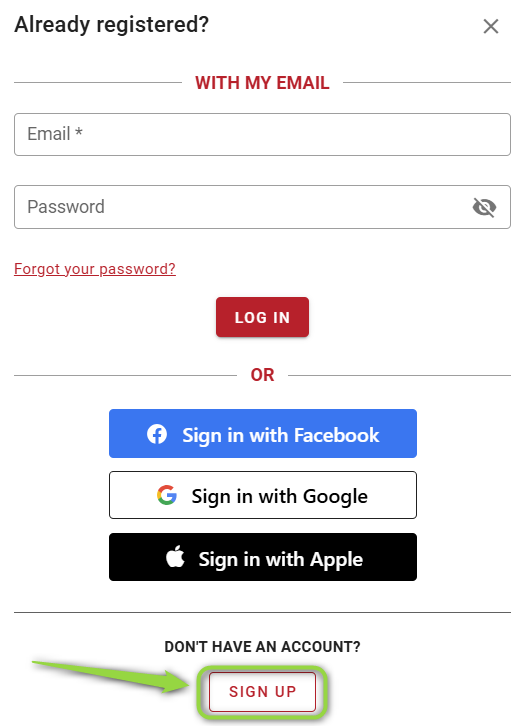 At the bottom of this page, click on "Sign up" (green frame on the image below indicated by an arrow)