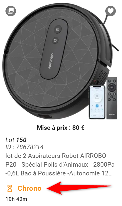 Les ventes Chrono et leurs lots sont reconnaissables sur notre site à l’icône orange Chrono :