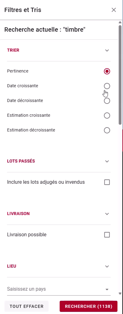 En cliquant sur "FILTRER", vous aurez accès au tri par Pertinence, Date croissante, Date décroissante, Estimation croissante, Estimation décroissante.