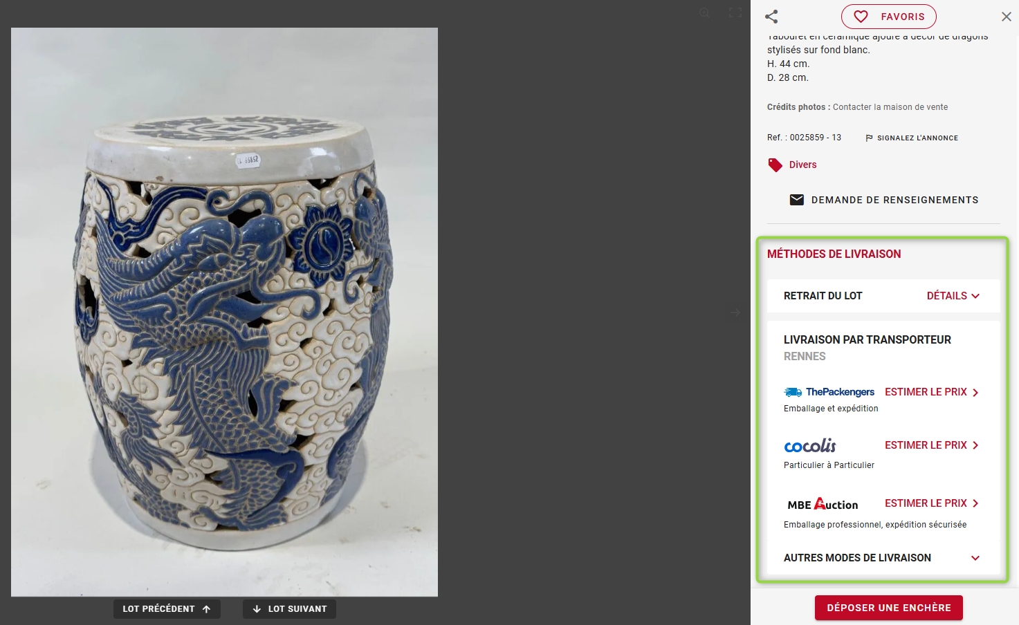 Pour les lots catégorisés « Mobilier et Objets d’art » (pièces de mobilier, tableaux, sculptures, bijoux, horlogerie, livres, vins, numismatique, musique, etc.), Interencheres propose aux Maisons de ventes de vous permettre d’organiser votre livraison avec la société de transport ThePackengers. Pour en savoir plus, rendez-vous sur l'article : Quels objets peuvent être livrés par ThePackengers ?