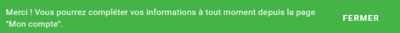 Votre compte sera alors créé et vous sera confirmé par cette pop-in verte :