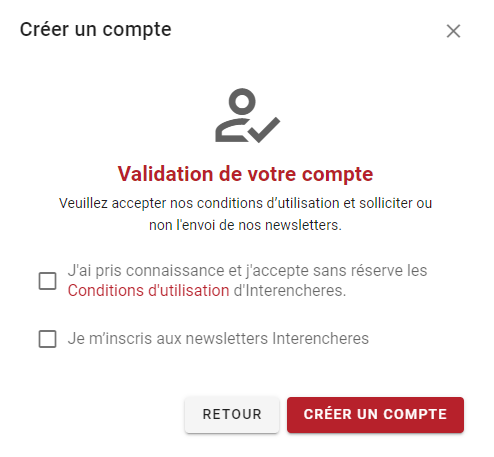 Après avoir complété cette étape, vous accéderez à la page de validation de votre compte. Cochez les cases puis cliquez sur le bouton rouge "Créer un compte".