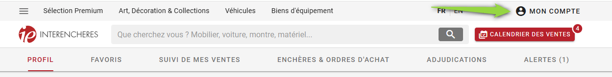 Sélectionnez « Mon compte » qui se situe en haut à droite de la page d'accueil (flèche verte sur l'image ci-dessous)