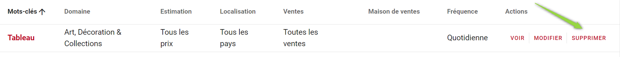 Une fois dans cet onglet, cliquez sur « Supprimer » tout à droite de la ligne correspondant à l'alerte que vous souhaitez supprimer (flèche verte).