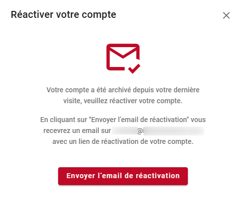 Pour réactiver un compte archivé et y accéder de nouveau, vous devez vous connecter à votre compte et cliquer sur "Envoyer l’email de réactivation" quand cette fenêtre apparait :