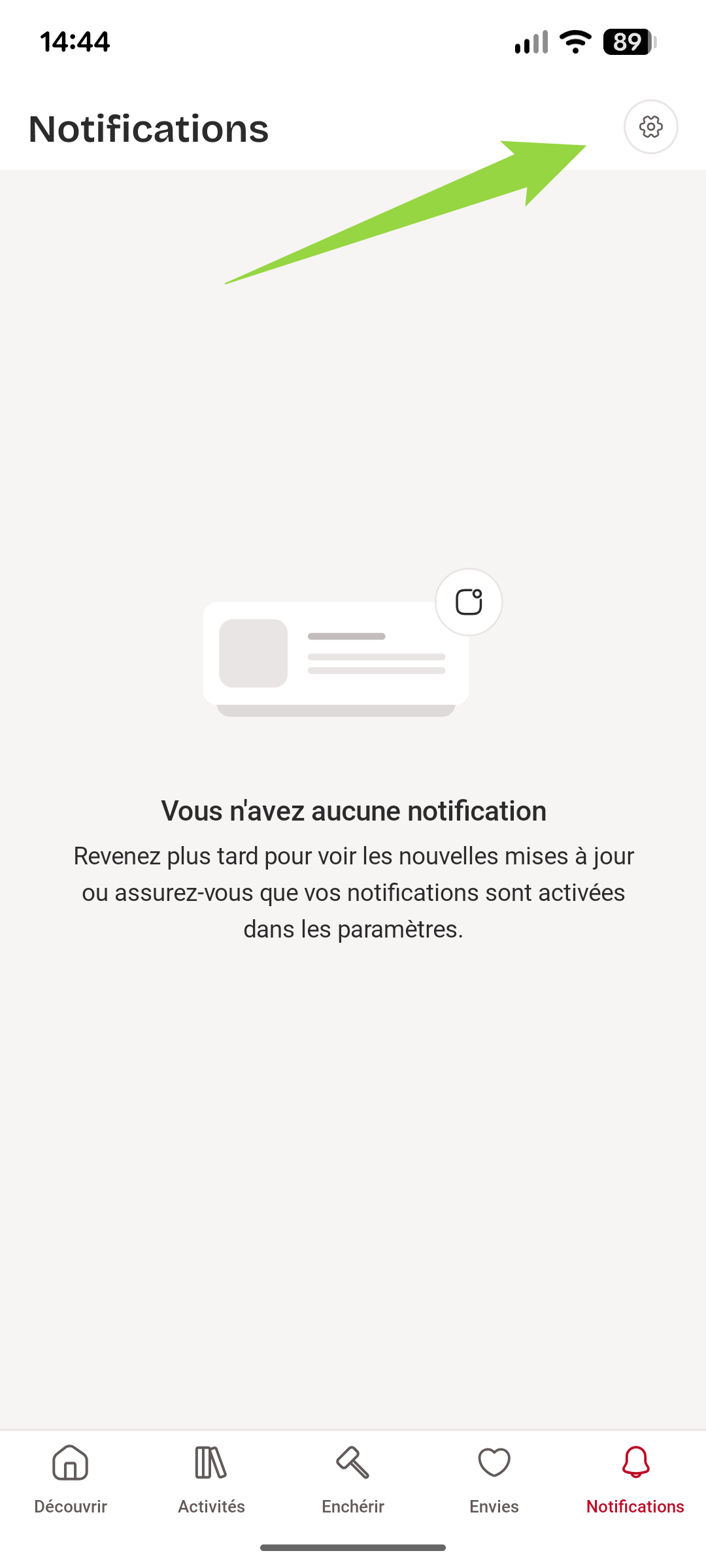 Vous pouvez être notifié lorsqu'un lot favori ou sur lequel vous avez déposé une enchère passe en vente. Pour cela, rendez-vous dans "Notifications" (en bas et à droite de l'écran) puis dans le menu de réglages identifié par une petite roue dentée en haut à droite de cette page.
