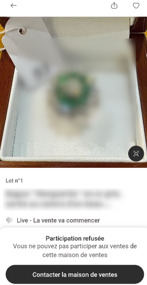 Pendant la durée d'application de cette décision, vous ne pourrez pas déposer d'enchères sur les ventes organisées par la Maison de ventes, mais vous conservez la possibilité de les suivre en direct sur Interencheres.