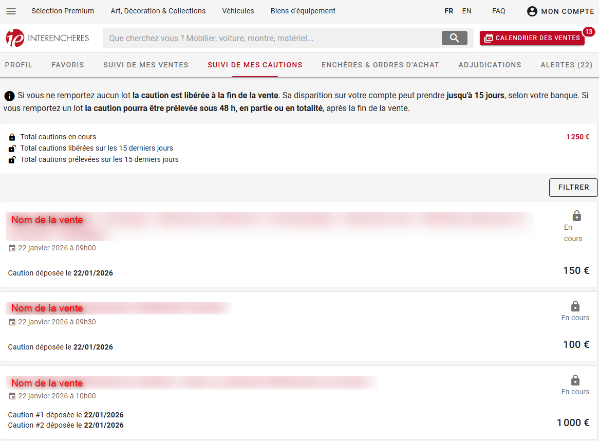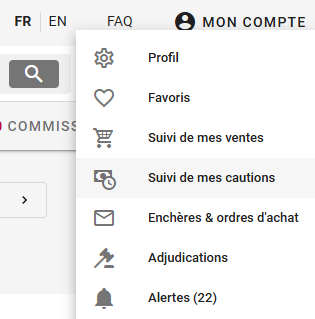 Vous pouvez vérifier le statut des cautions enregistrées lors de l'inscription à une vente depuis votre espace personnel.