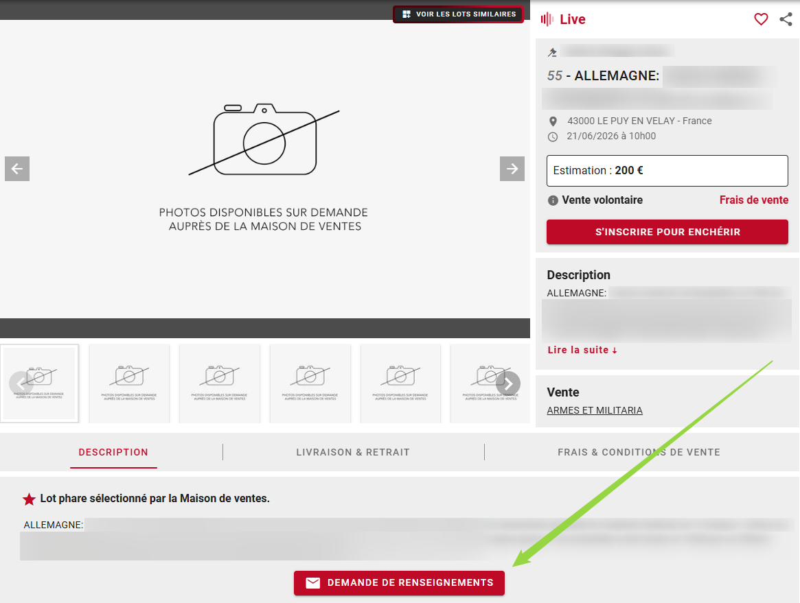 Pour cela, vous pouvez cliquer sur "Demande de renseignements" en bas de la page du lot concerné :
